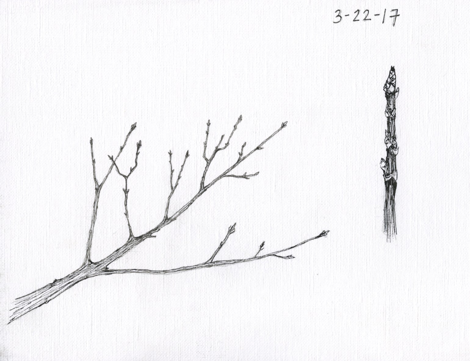 Thus begins a week-by-week study of the buds from one branch of one sugar maple tree living below the garden, within sight of the sugarhouse. It is still a child; its branches are low enough to touch and observe closely. In this drawing the buds are still tight.