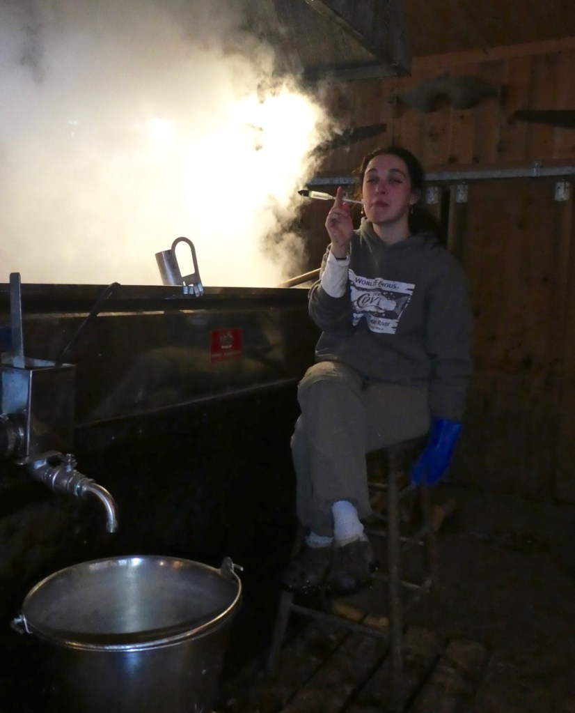 HOW’S IT RUNNING? Just as it should, the sap ran strongly midday and choked off at night. We got the daily quota of cold, clear sap; we established a pattern of daytime boiling.