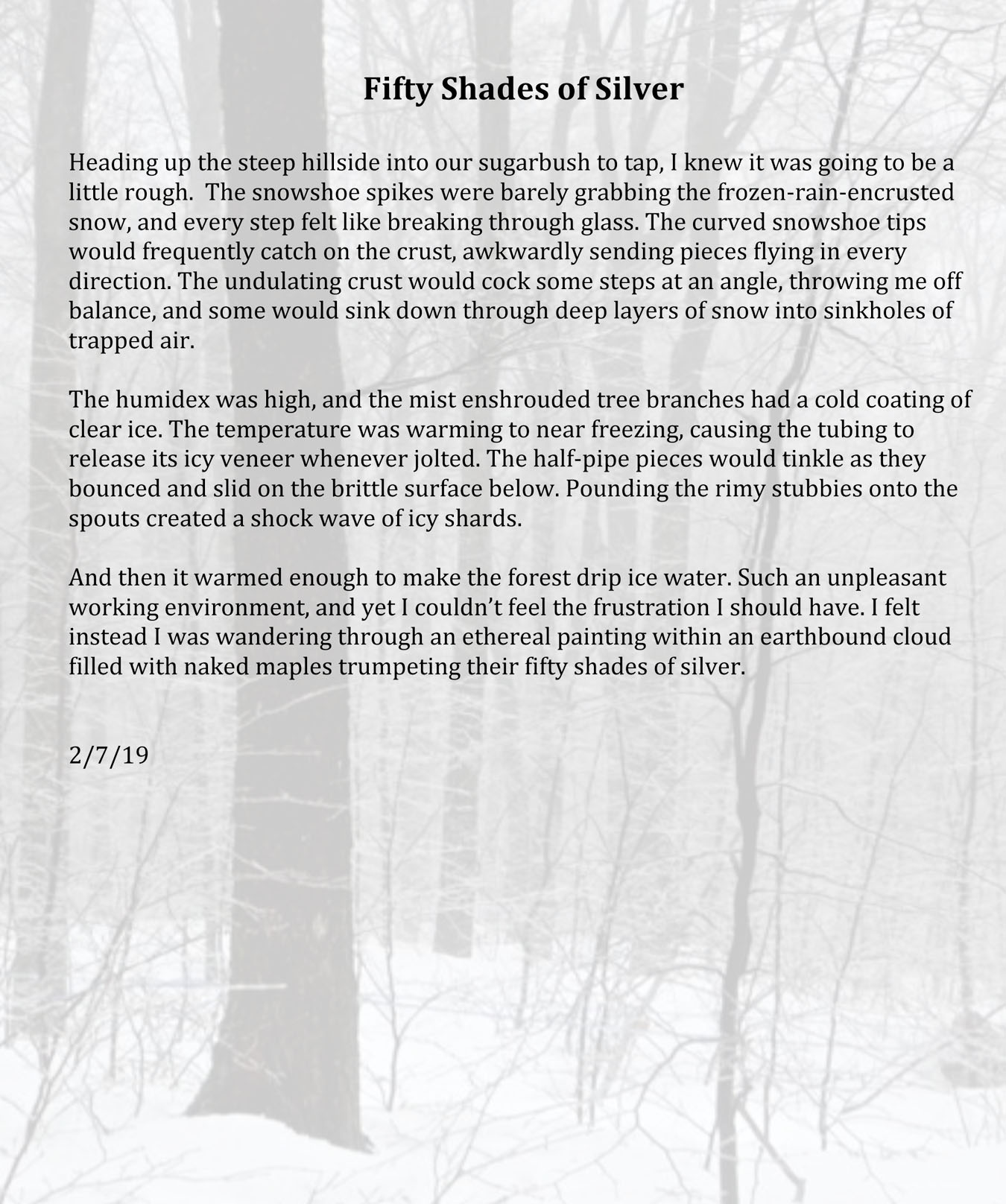 Day Five: 5563. Based on an estimated total of 9700 taps, the sugarbush is 58% tapped.