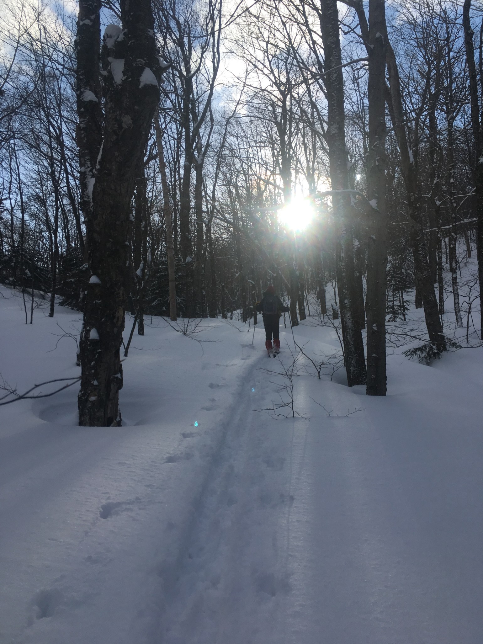 I swing right under a main line and angle up to a lane between ledge outcroppings and a ledgy mound where a sole hemlock grows. Under the snow is a campfire ring I built with young children in the early ’80’s when a neighbor Mary Batchelder and I ran a day camp. Mary spun stories from the summer air. We built our own miniature dome by lashing together branches we pulled off the forest floor. Its remnants decay under the snow. There’s comfort in this lane but no view.