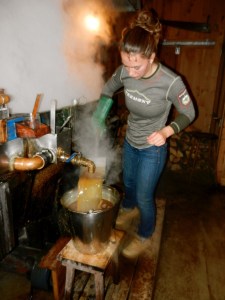Robyn: Yesterday was her first day working in the sugarhouse, and after only a few hours there she bravely stepped up to the plate to try drawing. She immediately leaned into the role with such an intense concentration that I momentarily had to catch my breath watching. The focused determination on her face said I will get this right. She proceeded to draw pail after pail in rapid fire through a surge, with the agility of the athlete she is.