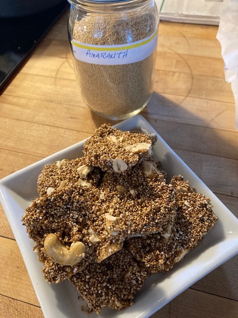 In Mexico the amaranth seeds are popped like popcorn and coated with maple and molasses. They are reminiscent of the cracker jacks we had as kids. I upped the nuts because the peanuts in cracker jacks were the best part.