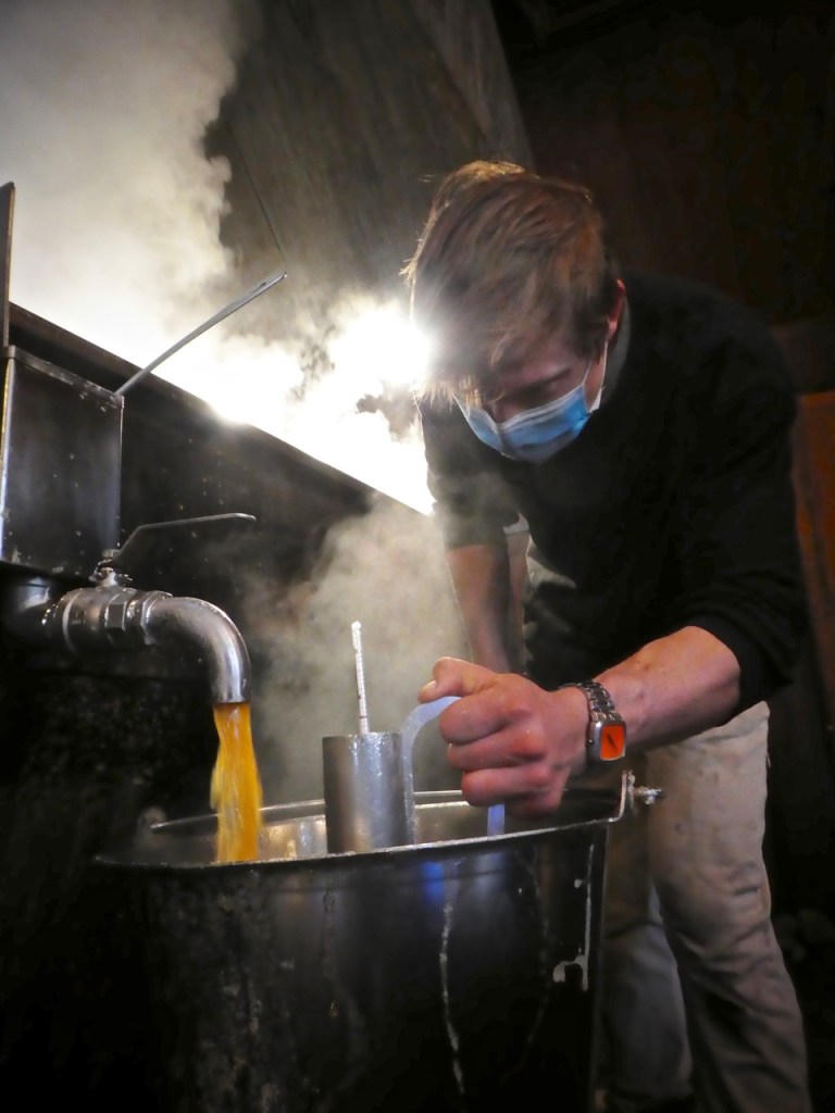 Walt focuses on learning the art of drawing off a pail of syrup.