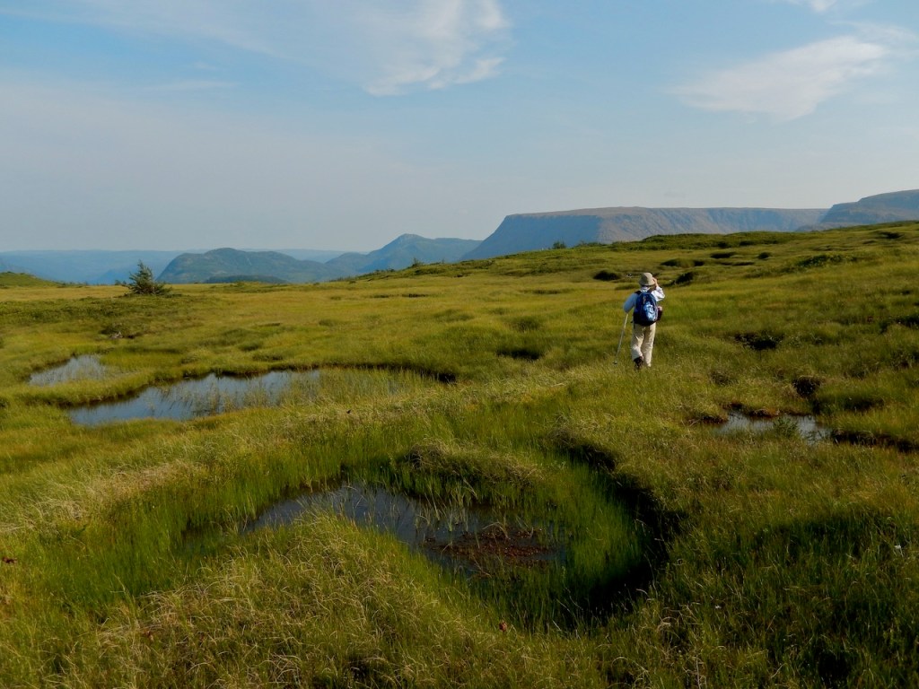 We are traversing one of Jill’s favorite fens in Gros Morne National Park. From the road it resembles a hillside pasture. To get there we meandered through sprawling junipers. The ground beneath felt firm. Where the meadow opened up, Jill loped to the left and we followed. The ground beneath turned spongy. The fen.