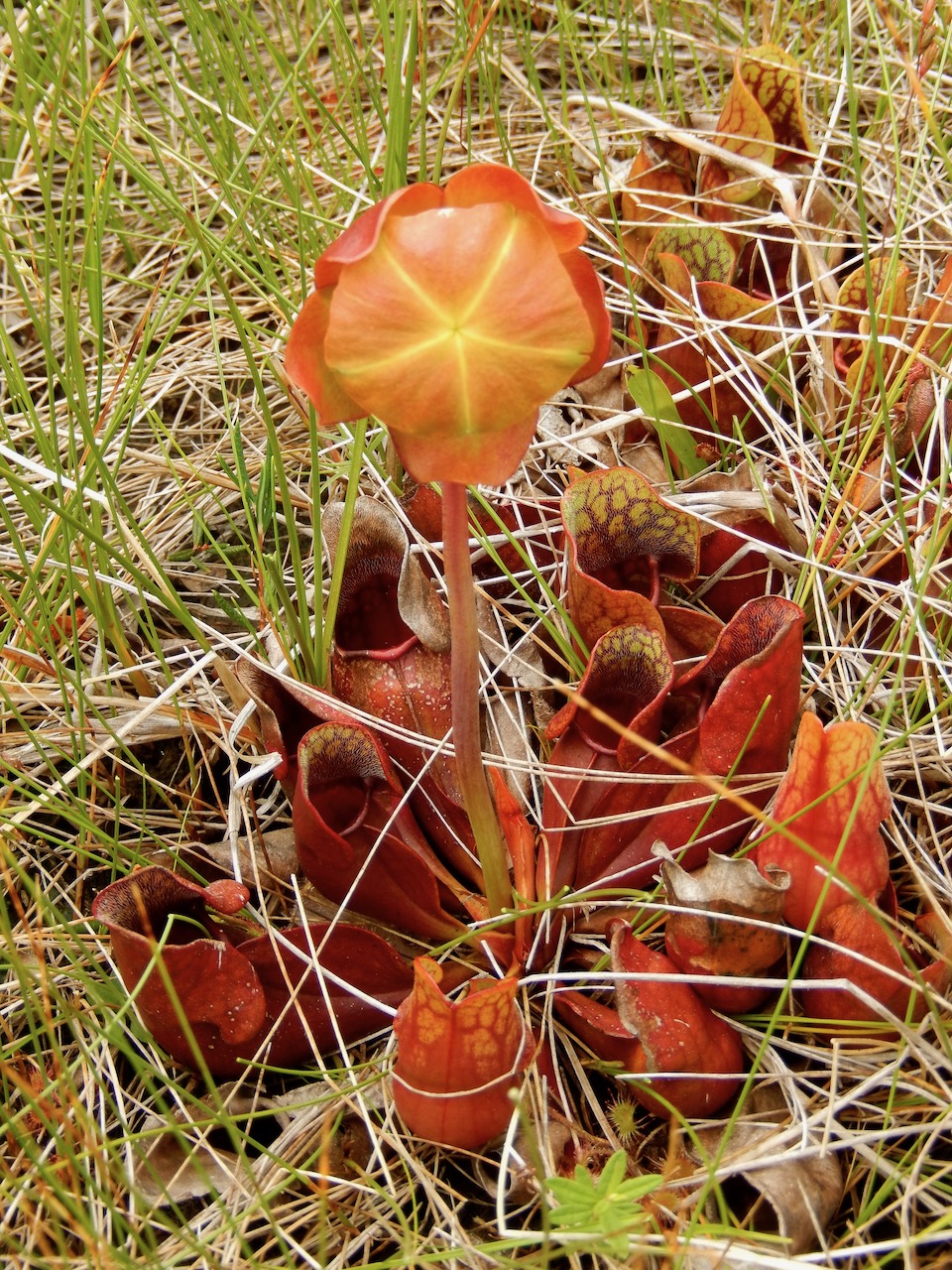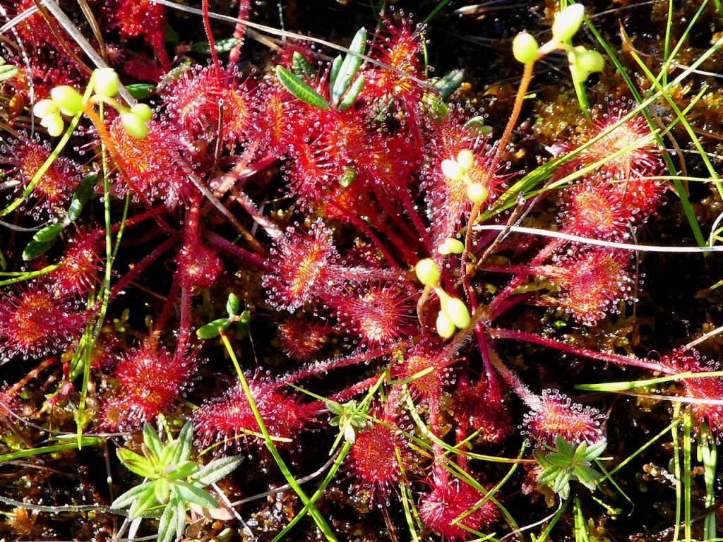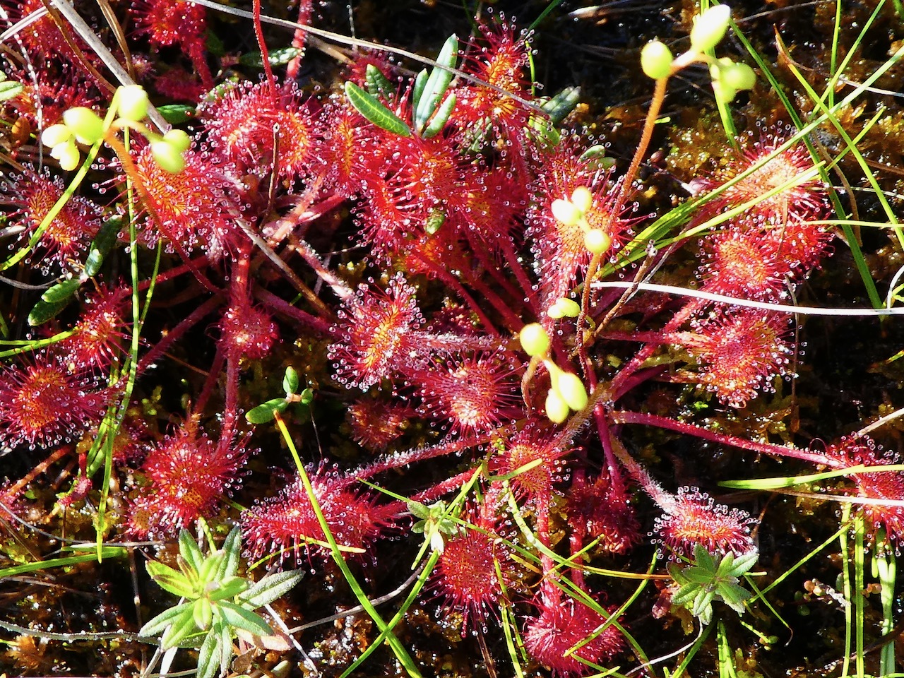 We squish across grassy stretches. Grasses? No, sedges. Grasses acquire oxygen through their roots, but in a fen, the land is so flooded that there is no oxygen down there. “Plants that don’t need roots grow in fens,” she explains.