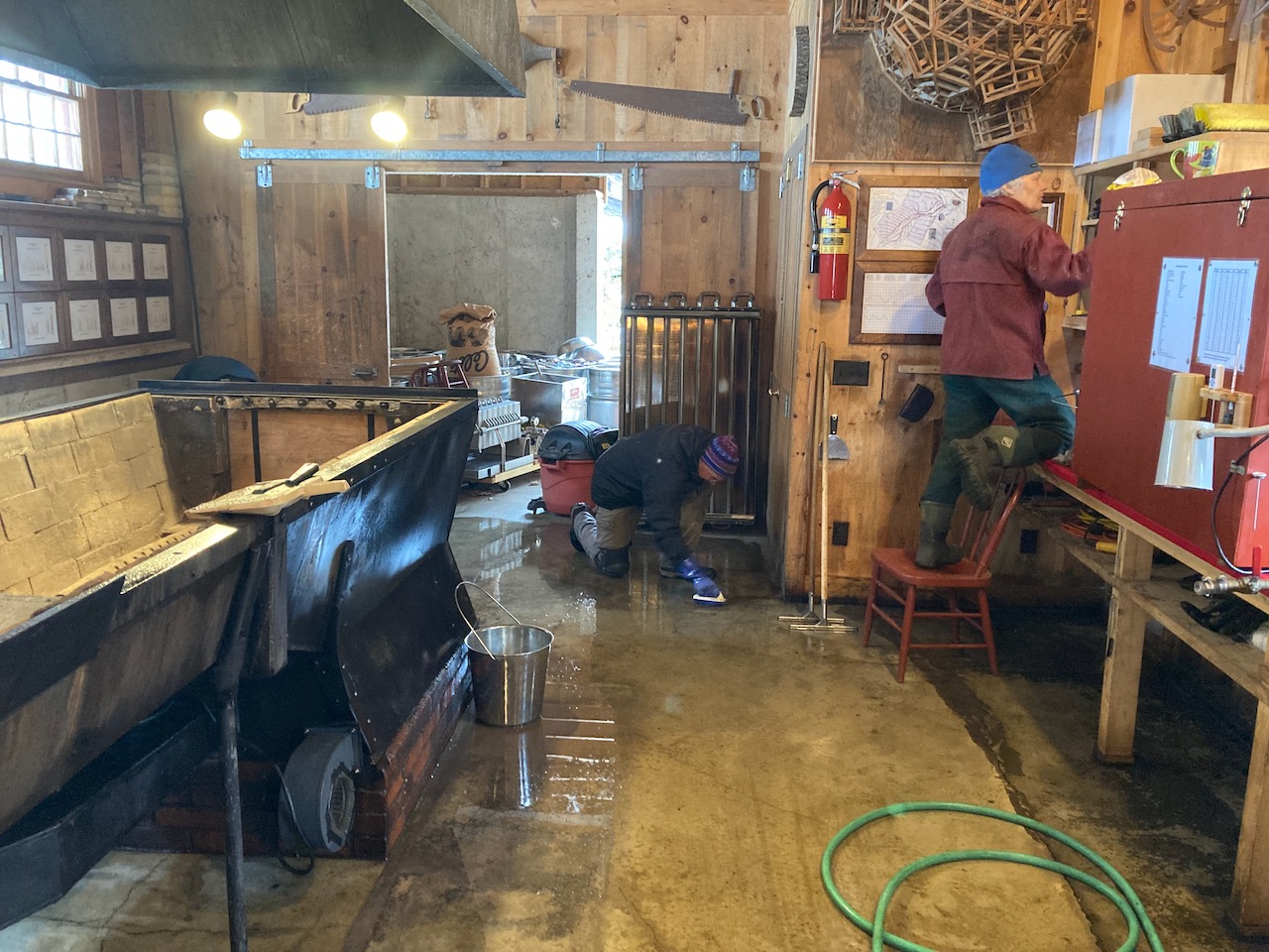 If you wait for mild sunny days to knock out taps and rinse lines, scrub and hose soot off the bottom of the front pan to load it into the van to drive to Leader Evaporator Inc. in Swanton, wash and hose pails, wipe down sap tanks with hot water, and so forth, you will never finish. On Tuesday and again today, Wednesday, winter returned. Slip-sliding through the woods to knock out taps and rinse lines, you’d be quickly soaked by wet snow falling from tree limbs, and besides, you can’t rinse frozen lines. We chose to work indoors. The evaporator room is notoriously cold on non-boiling days; applying elbow grease to a gunky floor warms you up quickly enough.