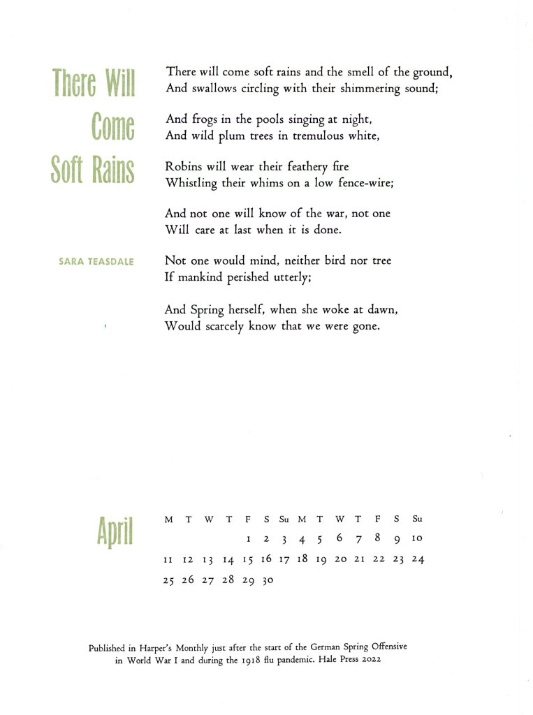 The following poem/calendar comes courtesy of neighbor and friend, Heather Hale. Each month she creates a calendar, letter-press prints a stack of them on one of her vintage presses, and gives them away on the first of the month. Here is her April offering.