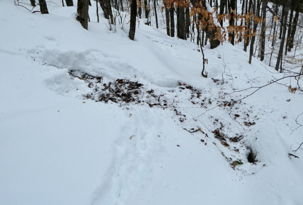 Veteran tapper Scatchard (Scratchard?) responds: “Those scratches sure do look like bear claw marks, but I don’t know of much reason they would claw into a maple, especially lower down like that. They will scratch off the bark and bite some softwood trees to leave scent marking for other bears. I took a picture of a tree on Long Snowshoe Trail at Edson Hill, where they did this.” See below.