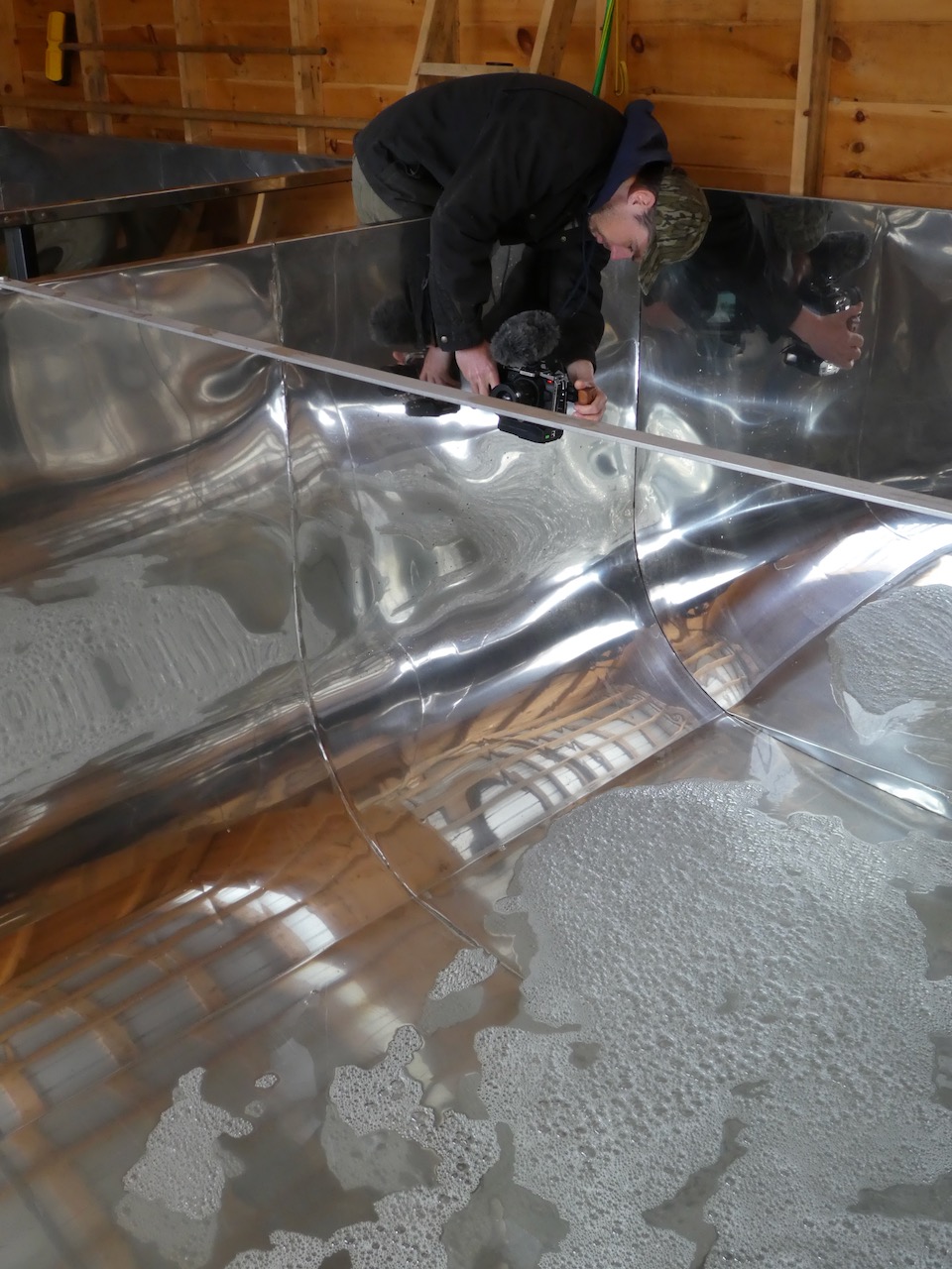 WEATHER: Today read like the final, summarizing paragraph of a March weather essay; the theme was “See how erratic the battle between sun and frost can be.” The day began with a frosty temp of 20 degrees. Morning sun quickly dispelled the chill…then clouds dampened the mood…then it snowed hard and is still snowing…then by midnight tonight it is supposed to rain…but the current temp is 32…and the sap ran poorly all day…we thought it might run all night tonight so we boiled briefly to get ahead of the run…but it is inefficient to fire up the evaporator for short little boils…and we regret it…though if the sap run does pick up dramatically overnight …which we don’t think it will, but we could be wrong…then we will say to ourselves that we made the right decision to boil today.