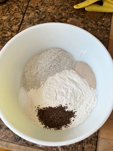 In a large bowl, whisk together the flours, salt, instant yeast, and caraway seeds, if using. In a medium bowl, whisk together the water and maple syrup. Add to the flour, followed by 1 tablespoon of oil. Using a rubber spatula, mix until the liquid is absorbed and the ingredients form a sticky dough ball.