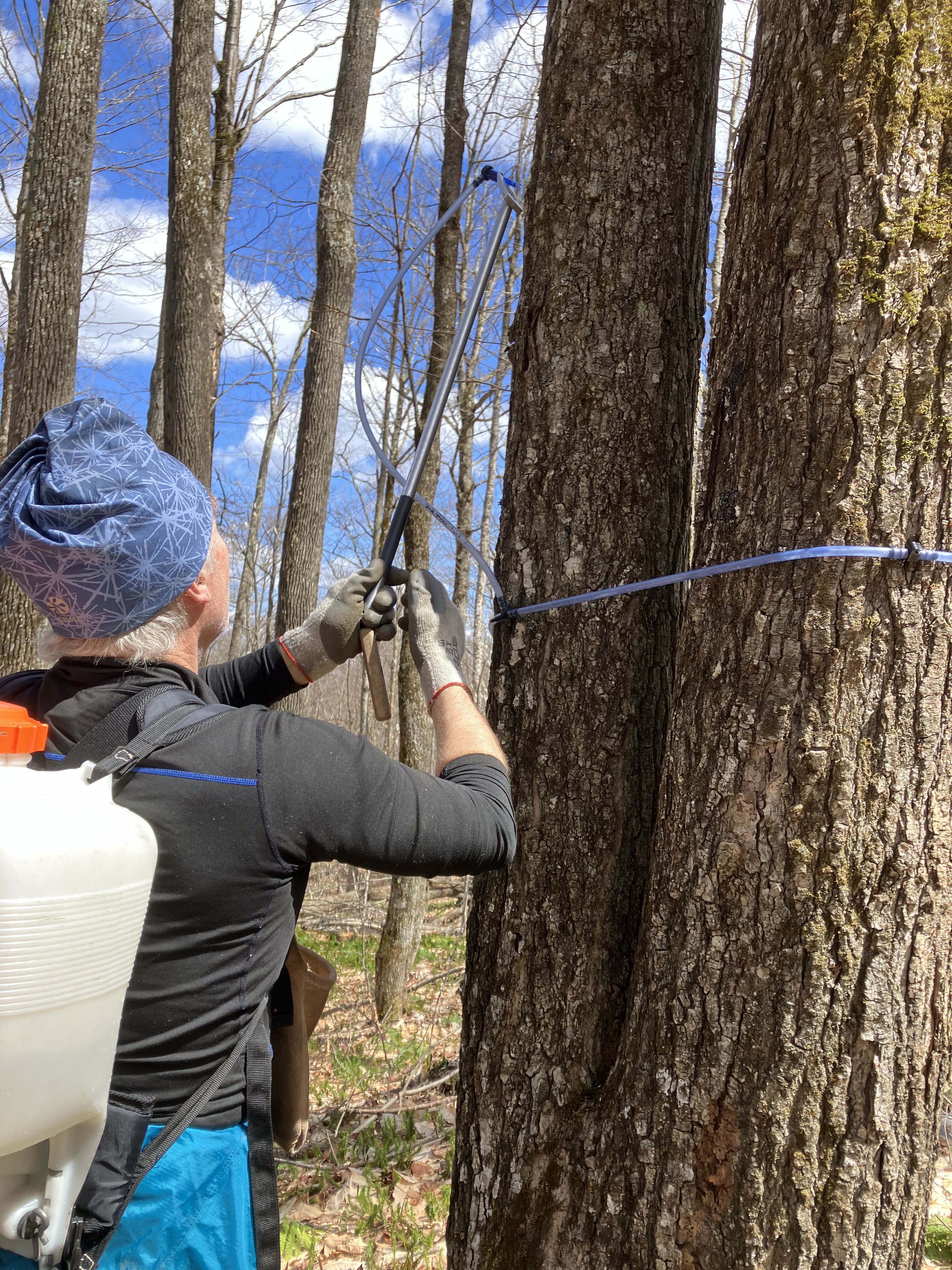 A day or two after we stopped collecting sap, the woods crew marched up the hill to knock out taps. The tapholes heal over the summer. [LL photo]