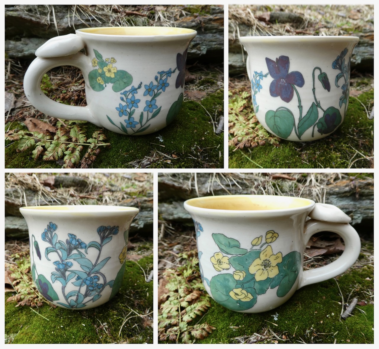 The 2024 Flower Show took place in front of the sugarhouse; it featured flowers common to Newfoundland which adorn this mug created by potter and crew member Jenn Galliott. From upper left moving clockwise the flowers are forget-me-not, violet, marsh marigold, and ???. [LC photo]