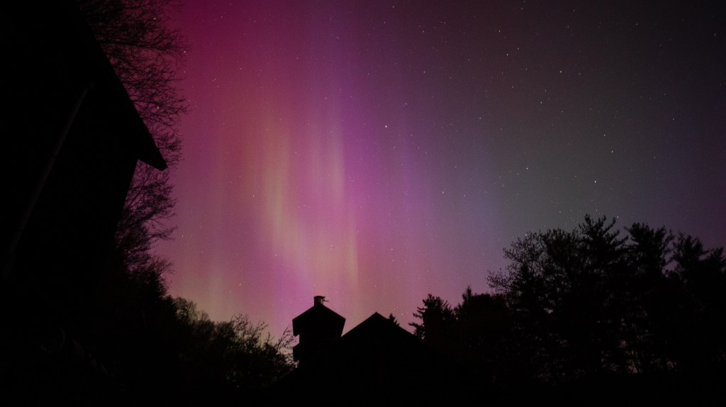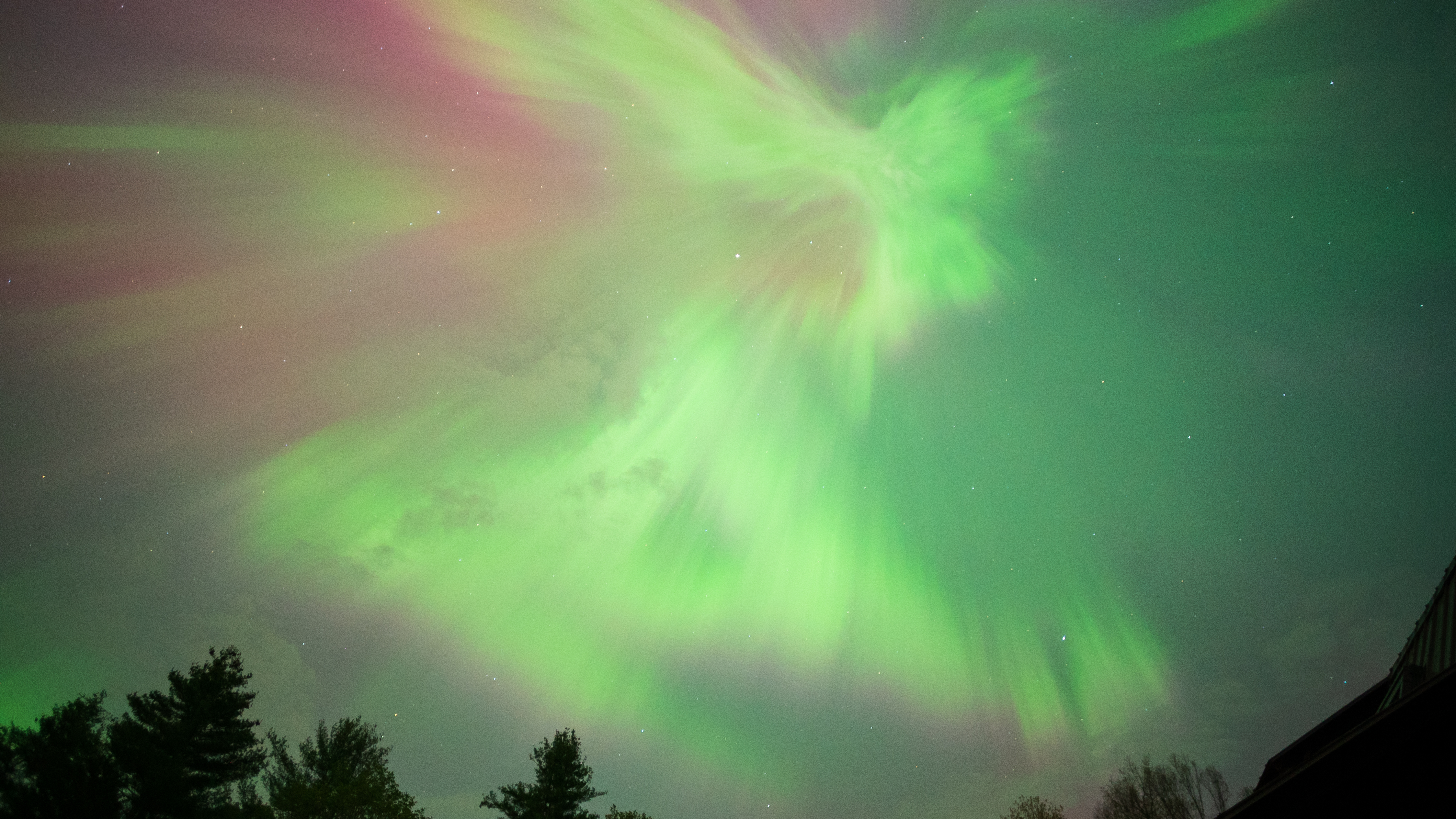 On May 10th the sky danced. Twice recently, first with the total solar eclipse, and then with the rare-for-Vermont aurora borealis display, the sun has stopped us busy sugarmakers in our Doing and called us to Be. This photo captures a moment during the height of the display. [FC photo]