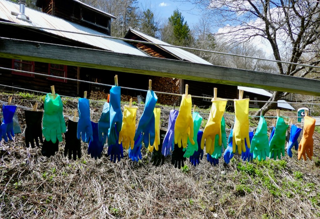 How many rubber gloves does it take to make a gallon of syrup? Wouldn’t you know, the weather turned and these gloves filled with rainwater. [LC photo]