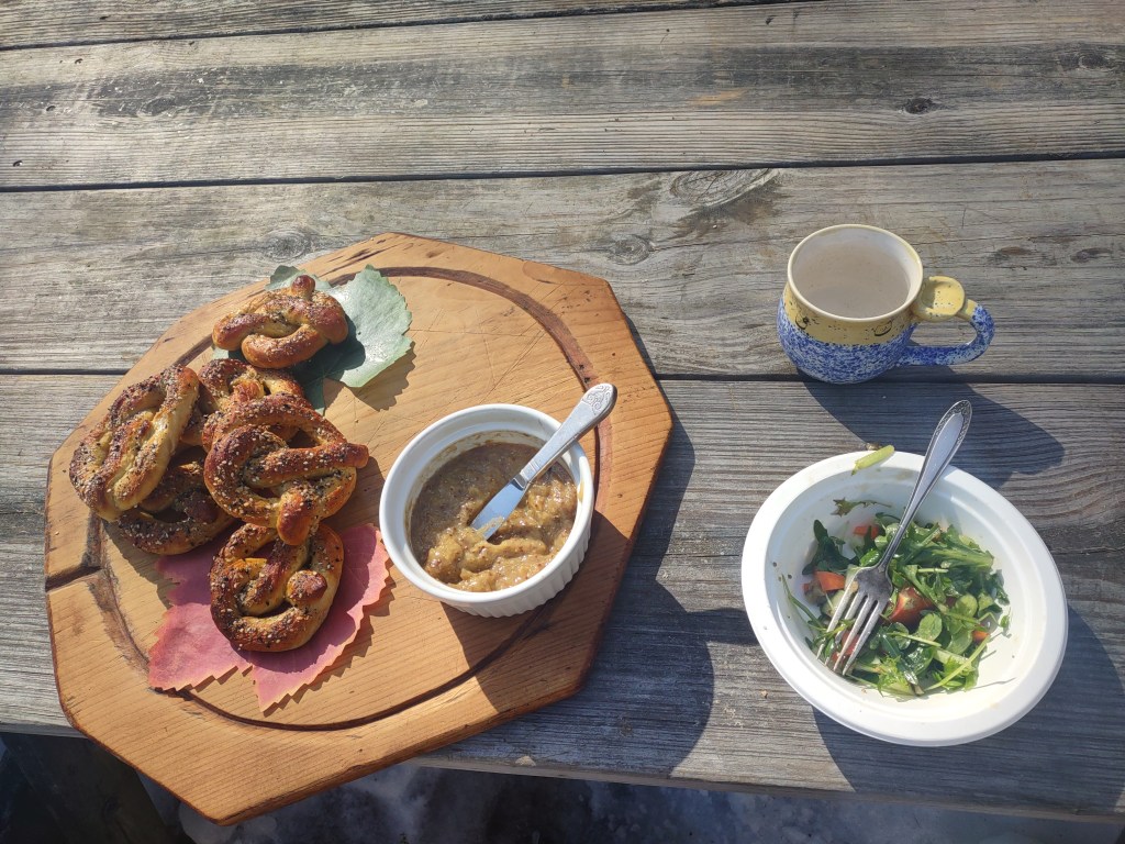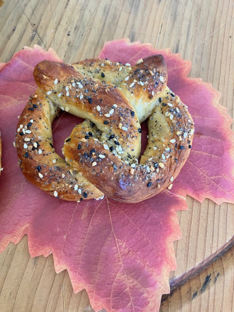 Let cool briefly. Serve warm. Pretzels reheat nicely — I love them halved, toasted, and spread with butter and maple onion mustard.
