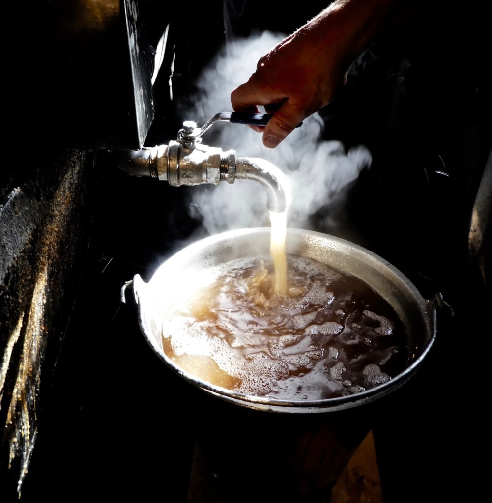 To collect syrup drips from the syrup tank nozzle sits a sticky silver pail.