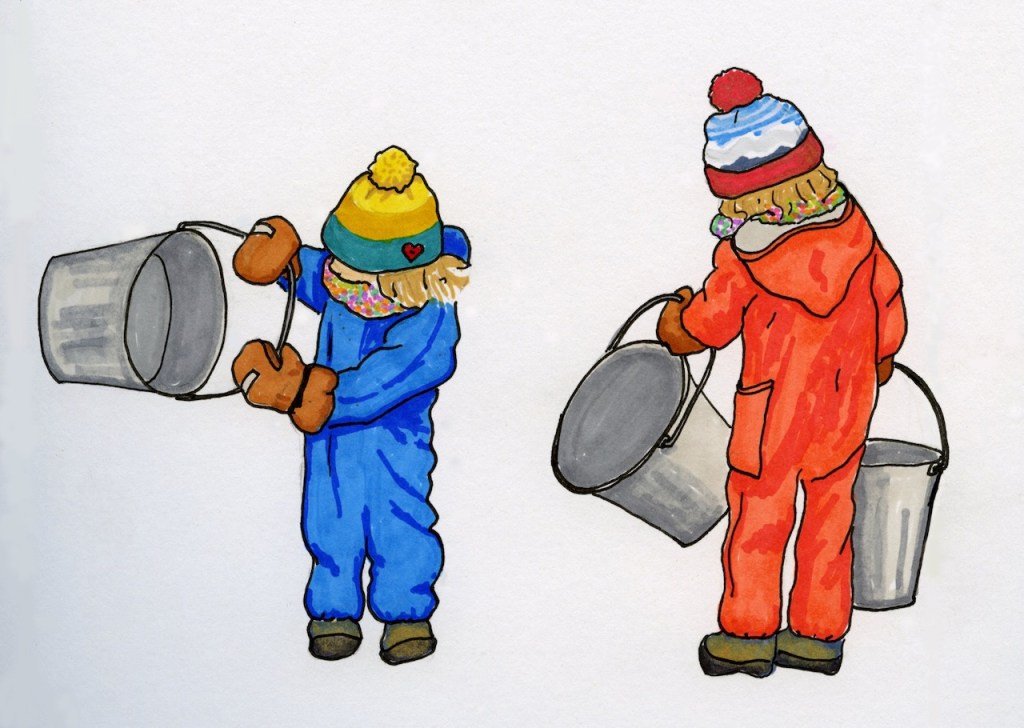 This pail, or bucket, hangs from a maple tree named Maggie. Sap drips into it; it holds sap.