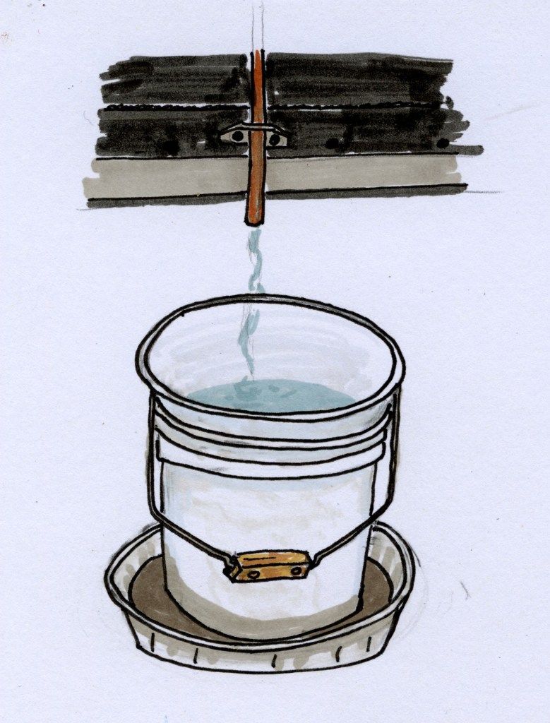 The white pail on the floor here near the evaporator collects drops of hot distilled water.