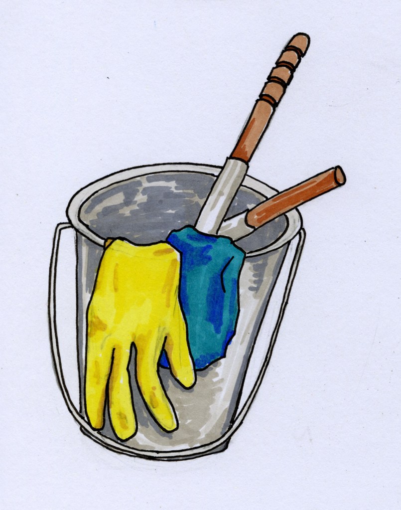 Draped with cleaning rags, some for the floor and others for surfaces, is a silver pail.