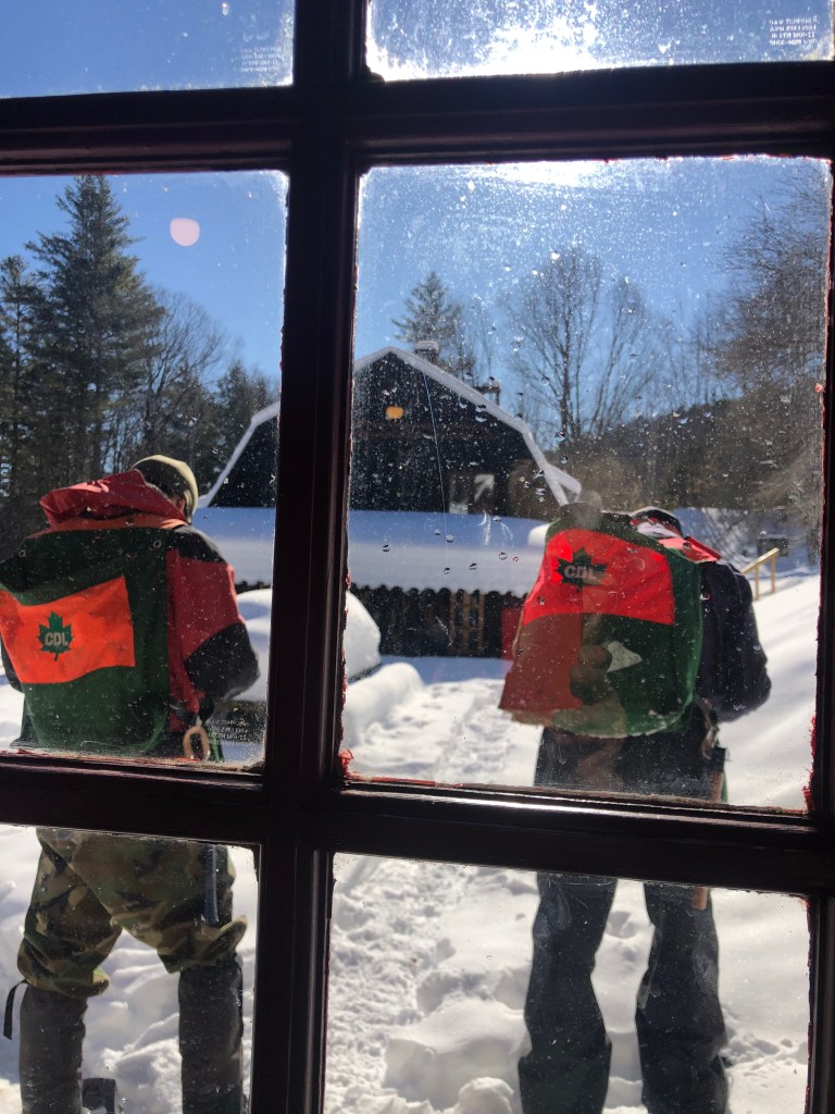 The universal stance in the Era of Cell Phones. But, no, Ross and Larry are arranging tools in the front pockets of their vests. Larry says as he heads out, “I wonder how long I’ll be gone before I take the Walk of Shame,” (trekking downhill to the sugarhouse to grab the overlooked tool).
